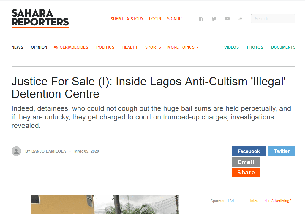 Damilola Banjo is currently on her master’s programme in Cultural and Media studies from the University of Ibadan. Her three-part investigative story- “Justice for Sale”, published on 5 March 2020 is an expose on the corruption in Nigeria’s judicial system. The first part of the report describes the notorious activities in the anti-cultism unit of the Nigerian police force. The second part documents the complicity of corrupt legal officers who sentence innocent citizens into prison and the final part concludes with extortion and exploitation of the family of convicts.