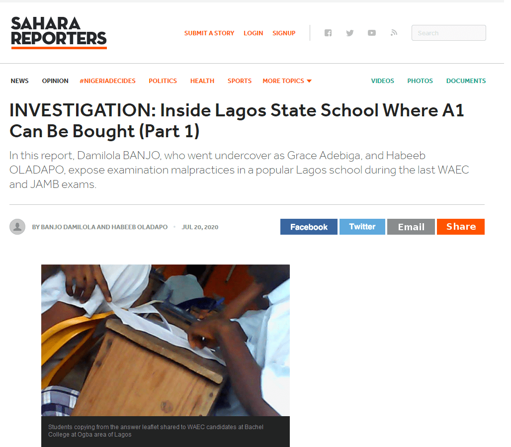 Their piece ‘Inside a Lagos state School where A1 can be bought’ published on 20 July 2020 was a six-month investigation of examination fraud and malpractice in Bachel College, a private school with branches in Ogba, Egbeda and Ayobo areas of Lagos state. The story highlights endemic examination malpractice perpetrated by a cartel of school owners, authorities and parents.