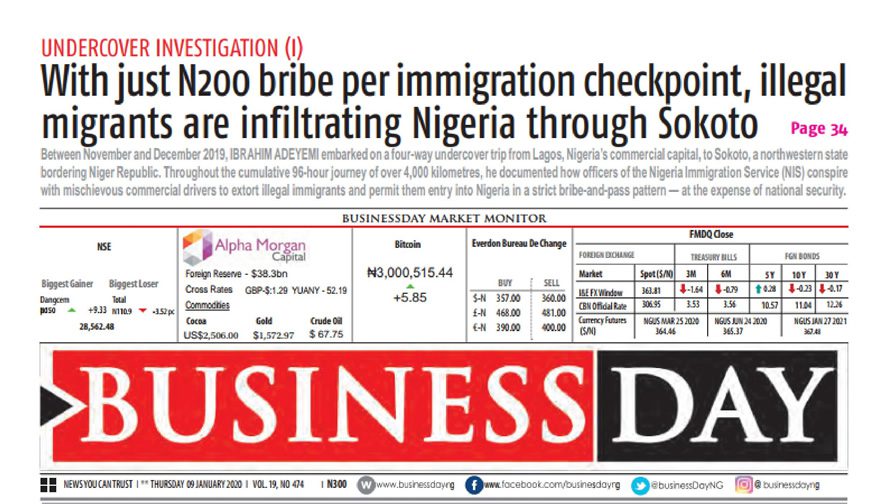 A creative writer, investigative reporter and a fact-checker with the Foundation for Investigative Journalism, Ibrahim Adeyemi’s undercover investigation is an expose on how the Nigeria Immigration Service compromise our national security with N200 bribe. In his story, “With just N200 bribe per immigration checkpoint, illegal migrants are infiltrating Nigeria through Sokoto” published in BusinessDay of 9 January 2020.