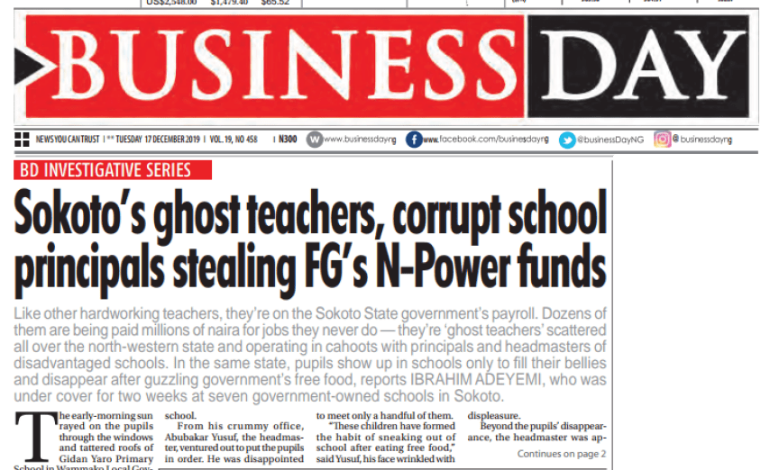 Through an undercover investigation, Ibrahim Adeyemi obtained evidence of how dozens of ghost teachers in seven government owned schools in Sokoto state get paid millions of naira for jobs they never do by conniving with the principals and headmasters of the disadvantaged schools. His report, “Sokoto’s ghost teachers, corrupt school principals, stealing FG’s N-Power funds’’ published in BusinessDay newspaper of 17 December 2019, uncovers massive corruption and human rights issues in Sokoto’s north-western state of Nigeria.