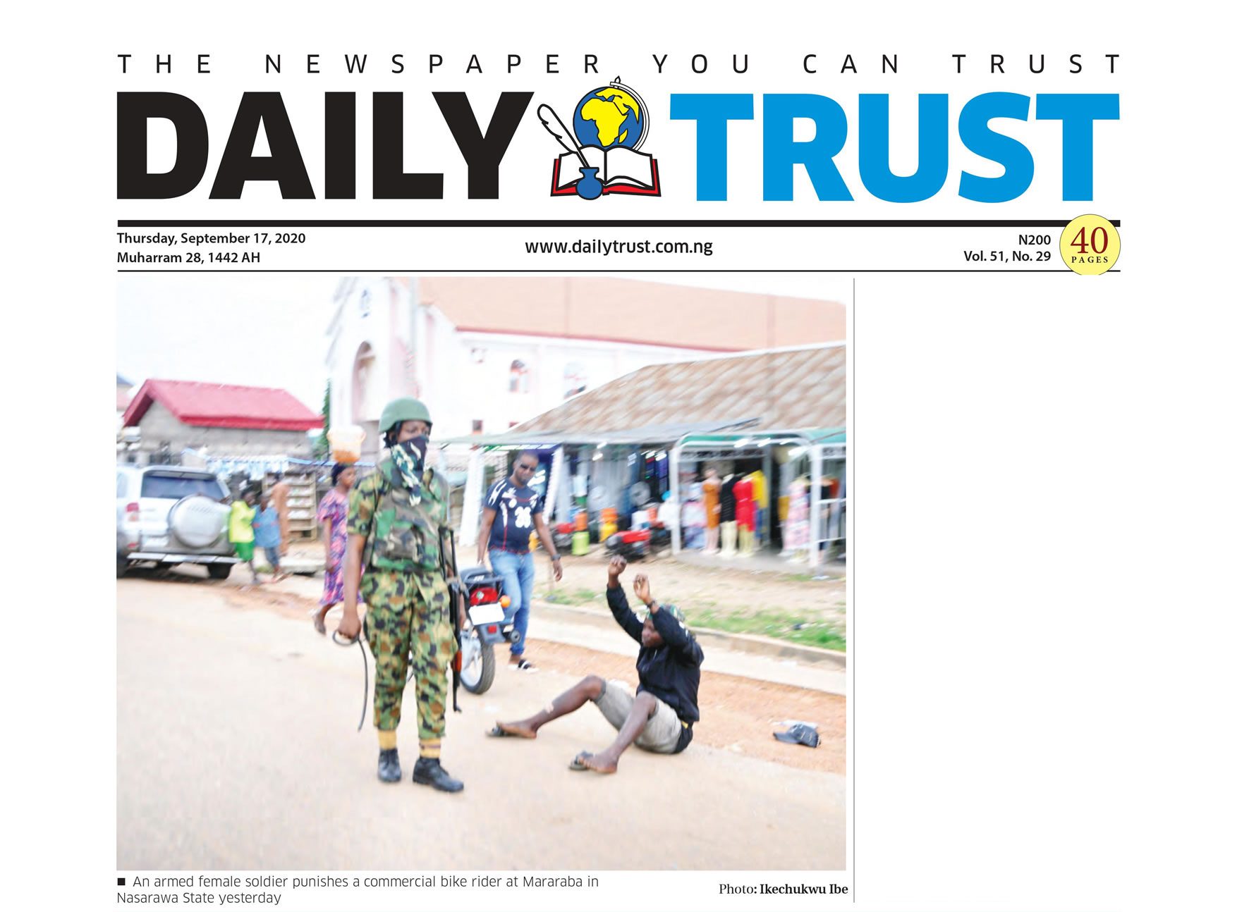 An armed solider punishing a commercial bike rider at Mararaba in Nasawara state is Ikechuwkwu Ibe’s photo which was published in Daily Trust Newspaper of 17 September 2020. It tells a powerful visual story of how security officials oppress and disrespect the human dignity of the common man.